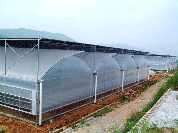 连栋温室是温室的一种升级存在,其实就是一种大温室, 把原有的单间温室,用科学的手段、合理的设计、好的材料将原有的独立单间模式温室连起来。连栋温室是一种经济型温室,它以优美的弧线形和造价低倍受用户欢迎。弧形室顶美观大方,视线流畅。结构用钢量小,保温性能好。制造成本相对较低,属经济型温室,适用于我国大部分地区。北方地区多采用双层膜温室,南方地区多选用单膜温室。能在可见光0.4-0.7微米范围内得到大光照,层膜充气后,可以形成厚厚的气囊,能有效地防止热量流失和阻止冷空气的侵入,采用双层充气膜后可大大提高温室保温性能,节省运行成本。覆盖材料顶部为聚乙烯无滴长寿膜覆盖,外层防紫外线,内层防集露;四周可以根据用户需要采用聚乙烯无滴长寿膜或聚碳酸酯中空板覆盖。