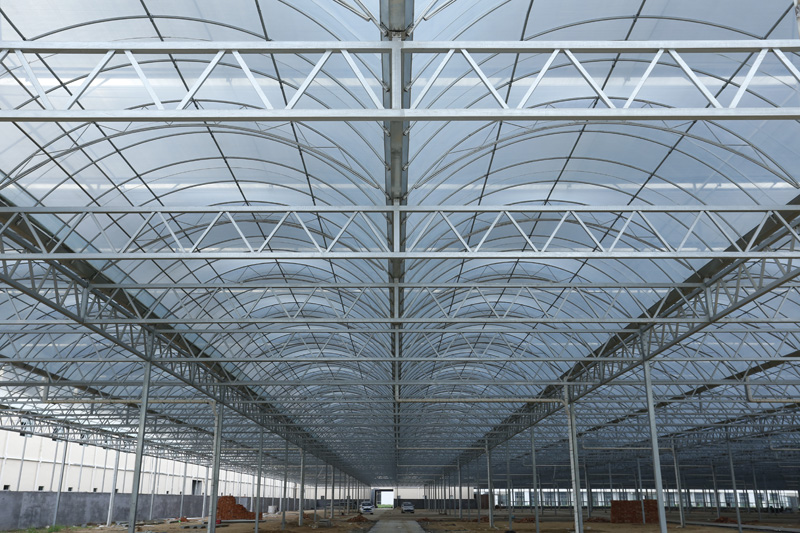 连栋温室是温室的一种升级存在,其实就是一种大温室, 把原有的单间温室,用科学的手段、合理的设计、好的材料将原有的独立单间模式温室连起来。连栋温室是一种经济型温室,它以优美的弧线形和造价低倍受用户欢迎。弧形室顶美观大方,视线流畅。结构用钢量小,保温性能好。制造成本相对较低,属经济型温室,适用于我国大部分地区。北方地区多采用双层膜温室,南方地区多选用单膜温室。能在可见光0.4-0.7微米范围内得到大光照,层膜充气后,可以形成厚厚的气囊,能有效地防止热量流失和阻止冷空气的侵入,采用双层充气膜后可大大提高温室保温性能,节省运行成本。覆盖材料顶部为聚乙烯无滴长寿膜覆盖,外层防紫外线,内层防集露;四周可以根据用户需要采用聚乙烯无滴长寿膜或聚碳酸酯中空板覆盖。