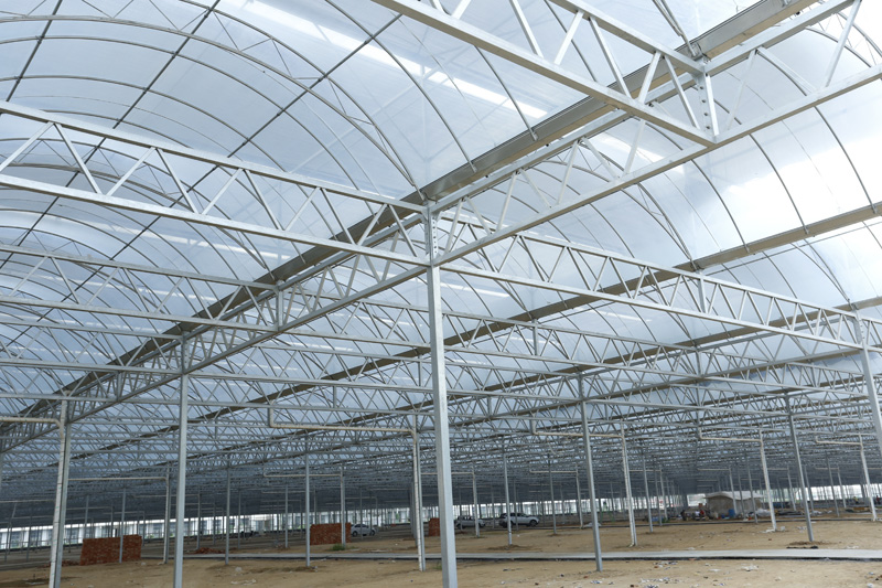 连栋温室是温室的一种升级存在,其实就是一种大温室, 把原有的单间温室,用科学的手段、合理的设计、好的材料将原有的独立单间模式温室连起来。连栋温室是一种经济型温室,它以优美的弧线形和造价低倍受用户欢迎。弧形室顶美观大方,视线流畅。结构用钢量小,保温性能好。制造成本相对较低,属经济型温室,适用于我国大部分地区。北方地区多采用双层膜温室,南方地区多选用单膜温室。能在可见光0.4-0.7微米范围内得到大光照,层膜充气后,可以形成厚厚的气囊,能有效地防止热量流失和阻止冷空气的侵入,采用双层充气膜后可大大提高温室保温性能,节省运行成本。覆盖材料顶部为聚乙烯无滴长寿膜覆盖,外层防紫外线,内层防集露;四周可以根据用户需要采用聚乙烯无滴长寿膜或聚碳酸酯中空板覆盖。